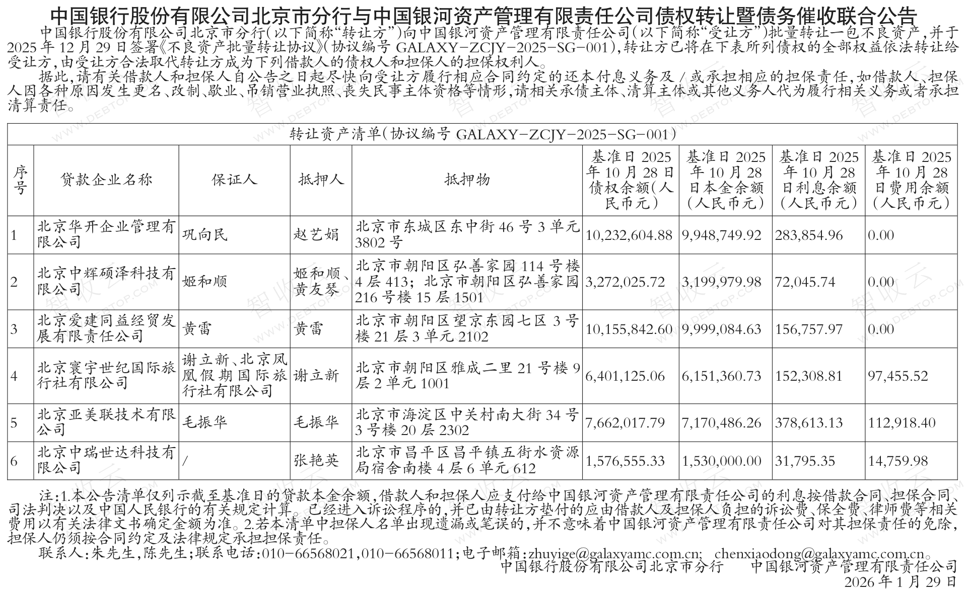 北京华开企业管理有限公司,北京中辉硕泽科技有限公司,中国银行股份有限公司北京市分行与中国银河资产管理有限责任公司债权转让暨债务催收联合公告,公告日期:2026-01-29,转让方:中国银行股份有限公司北京市分行,受让方:中国银河资产管理有限责任公司,资产总额:3930.0万元。