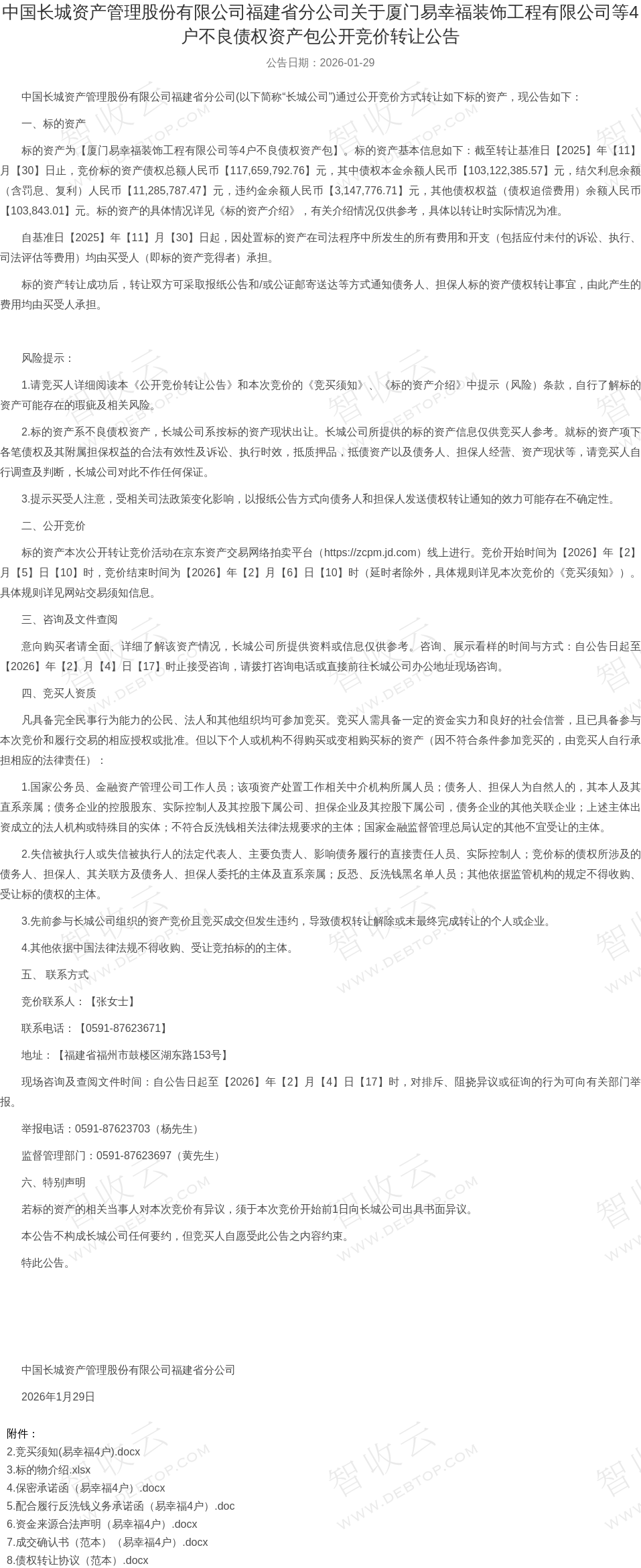 厦门隆明博贸易有限公司,厦门易幸福装饰工程有限公司,中国长城资产管理股份有限公司福建省分公司关于厦门易幸福装饰工程有限公司等4户不良债权资产包公开竞价转让公告,公告日期:2026-01-29,债权方:中国长城资产管理股份有限公司福建省分公司,资产总额:11755.6万元。