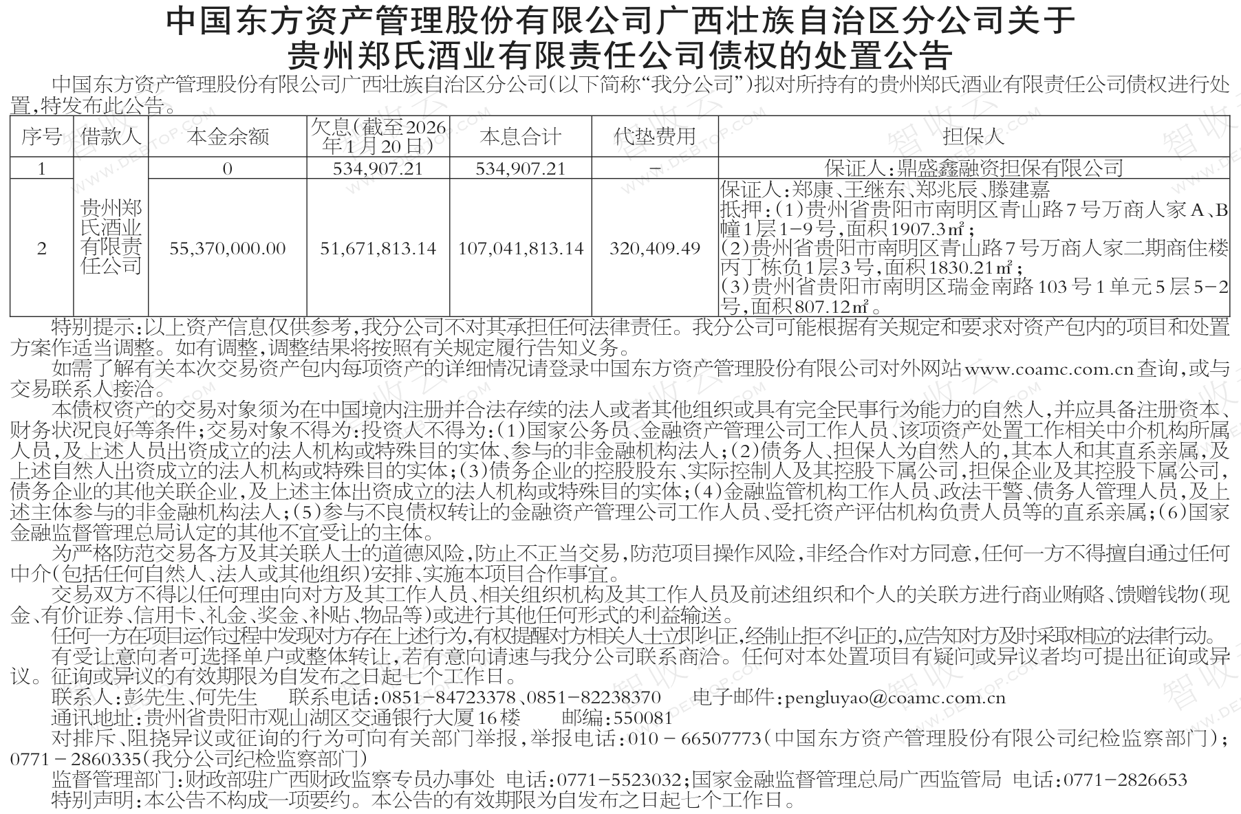 贵州郑氏酒业有限责任公司中国东方资产管理股份有限公司广西壮族自治区分公司关于贵州郑氏酒业有限责任公司债权的处置公告