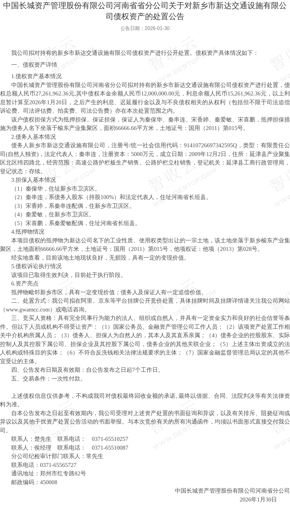 新乡市新达交通设施有限公司,中国长城资产管理股份有限公司河南省省分公司关于对新乡市新达交通设施有限公司债权资产的处置公告,公告日期:2026-01-30,债权方:中国长城资产管理股份有限公司河南省分公司,资产总额:2726.2万元。