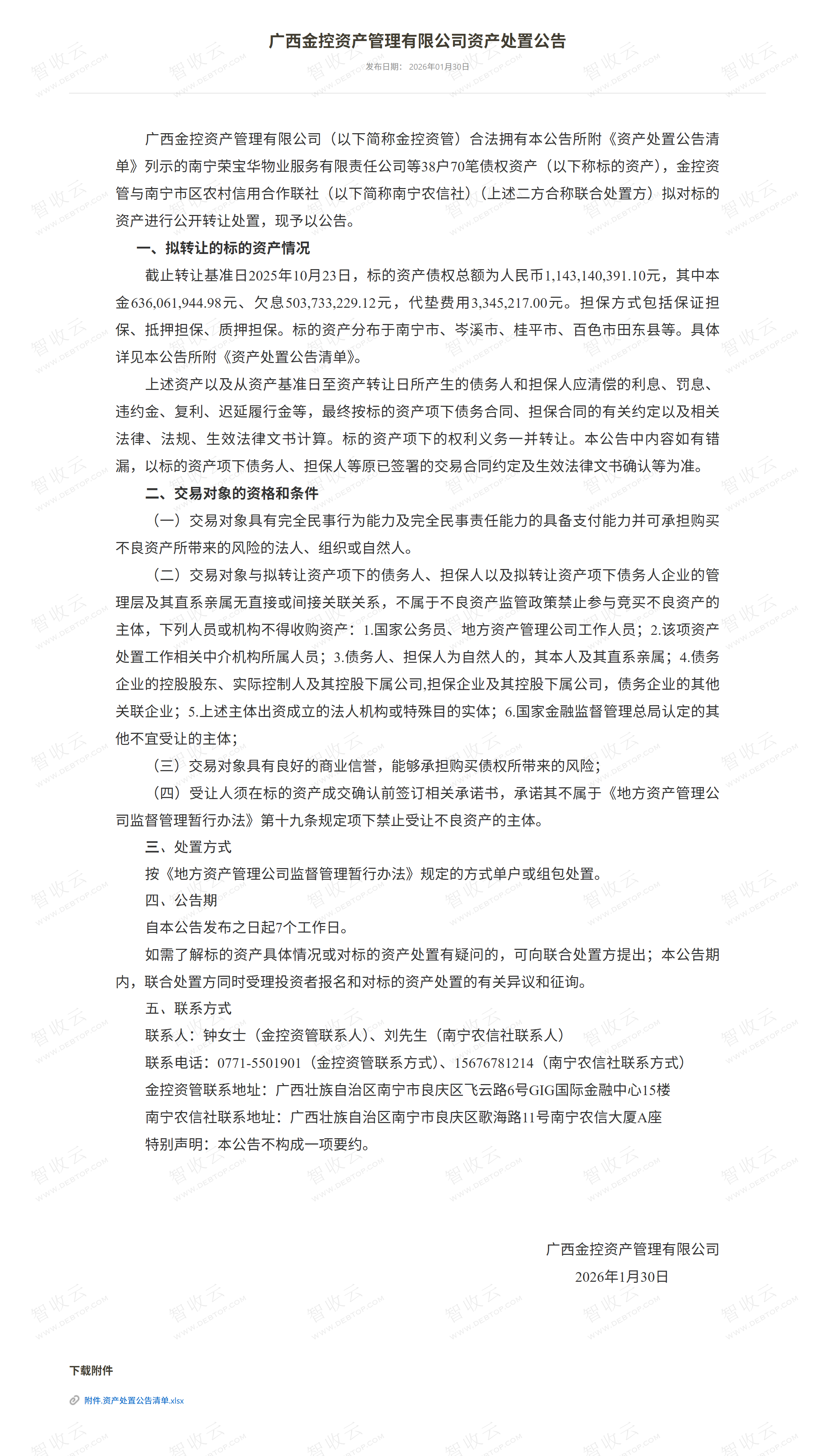 广西新闽航海运有限责任公司,广西华美纸业集团有限公司,广西金控资产管理有限公司资产处置公告,公告日期:2026-01-30,债权方:广西金控资产管理有限公司,资产总额:114385.8万元。
