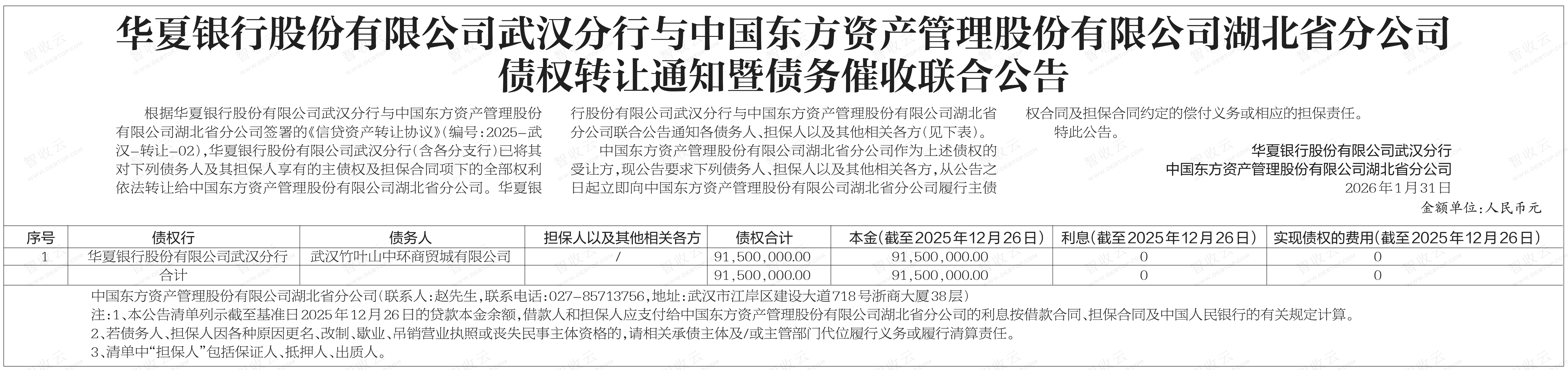 武汉竹叶山中环商贸城有限公司,华夏银行股份有限公司武汉分行与中国东方资产管理股份有限公司湖北省分公司债权转让通知暨债务催收联合公告,公告日期:2026-01-31,转让方:华夏银行股份有限公司武汉分行,受让方:中国东方资产管理股份有限公司湖北省分公司,资产总额:9150.0万元。
