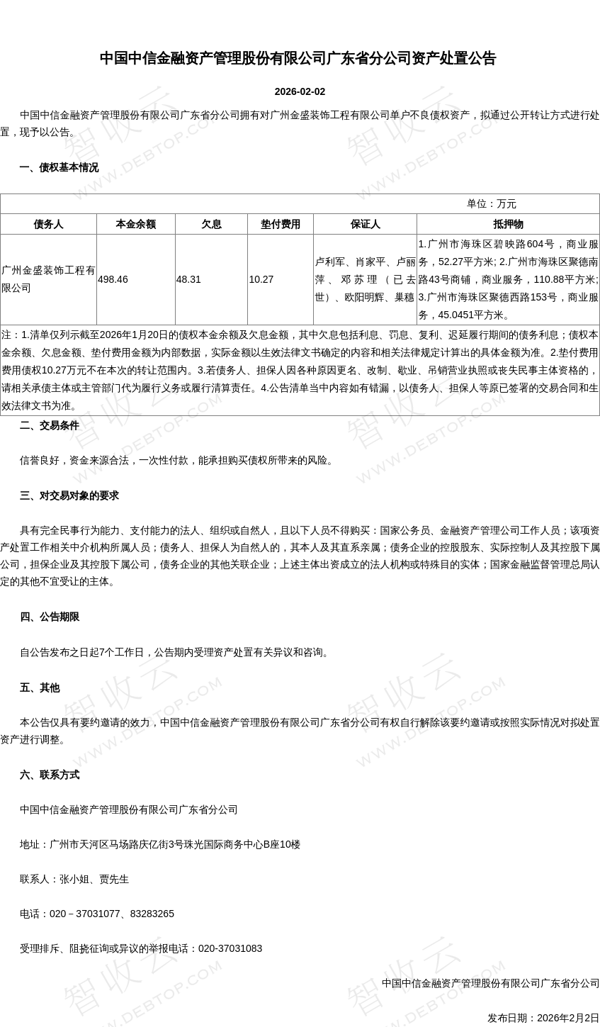 广州金盛装饰工程有限公司,中国中信金融资产管理股份有限公司广东省分公司资产处置公告,公告日期:2026-02-02,债权方:中国中信金融资产管理股份有限公司广东省分公司,资产总额:557.0万元。