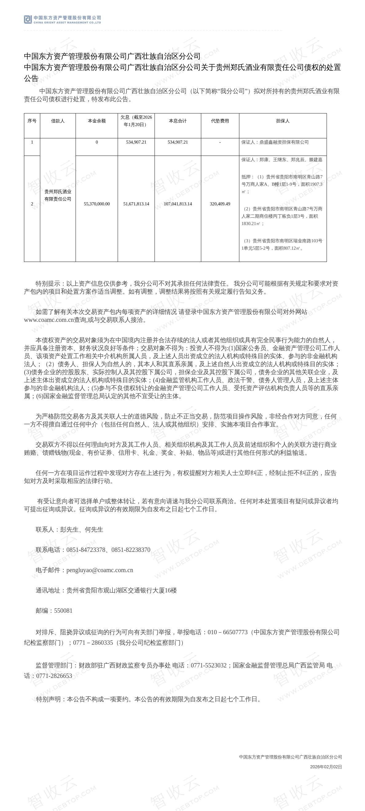 贵州郑氏酒业有限责任公司,鼎盛鑫融资担保有限公司,中国东方资产管理股份有限公司广西壮族自治区分公司关于贵州郑氏酒业有限责任公司债权的处置公告,公告日期:2026-02-02,债权方:中国东方资产管理股份有限公司广西壮族自治区分公司,资产总额:10789.7万元。