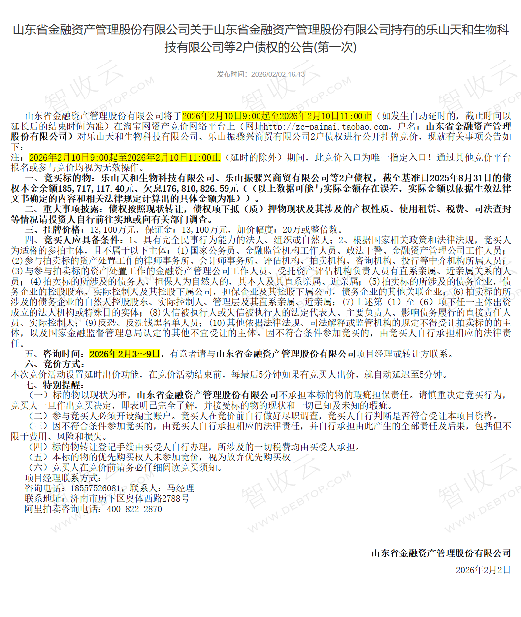 乐山天和生物科技有限公司,乐山振骤兴商贸有限公司,山东省金融资产管理股份有限公司关于山东省金融资产管理股份有限公司持有的乐山天和生物科技有限公司等2户债权的公告(第一次),公告日期:2026-02-02,债权方:山东省金融资产管理股份有限公司,资产总额:36252.8万元。